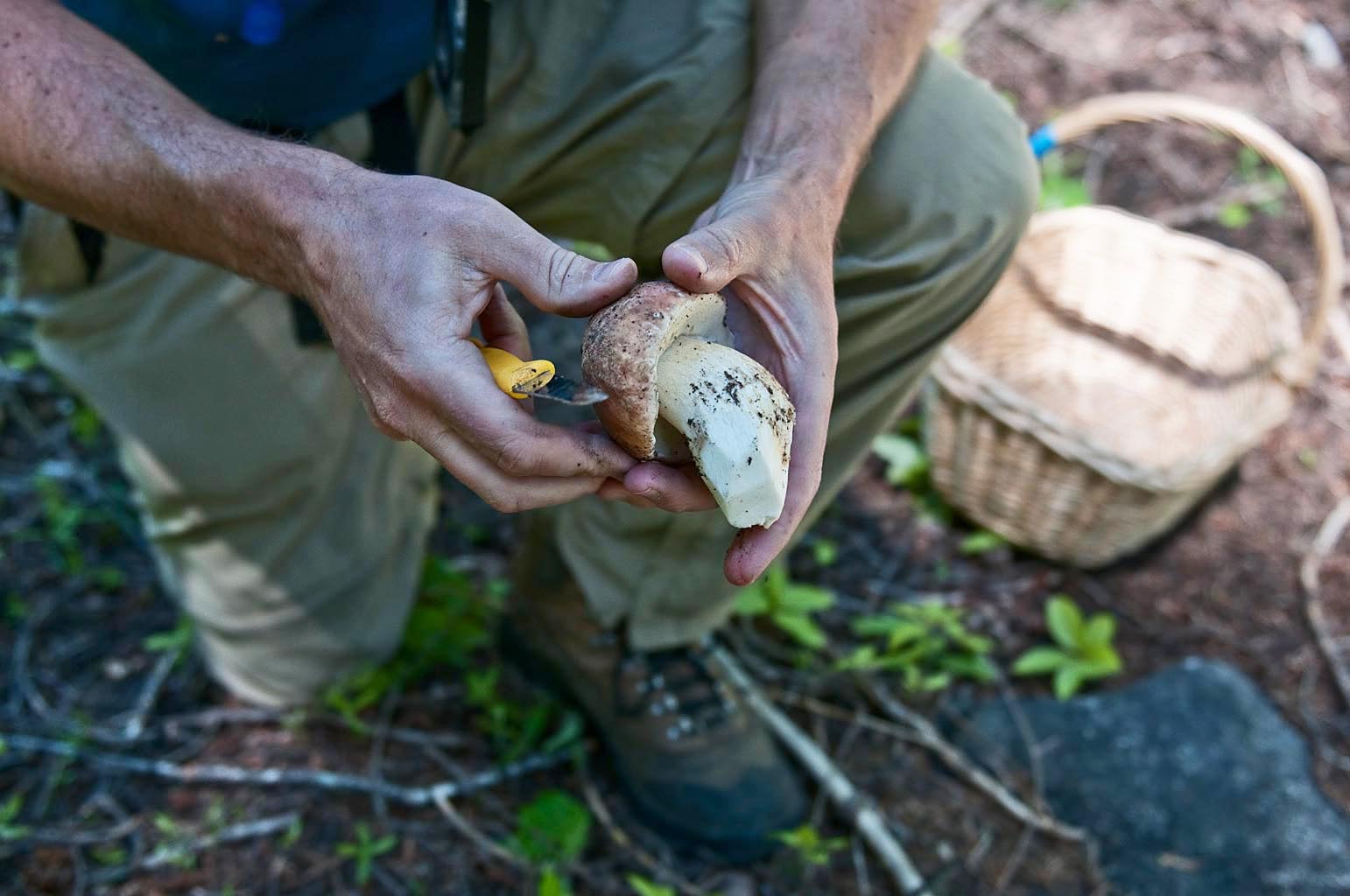 I scanned the pine needle-covered ground and spotted two porcini right away. Too easy! Lang showed us how to gently dig around their edges and where on the base to cut them, ensuring that any remaining nubs might have a chance to grow. Then he showed us how to cut away the dirtiest parts of the base, which is part of the "field dressing" process.